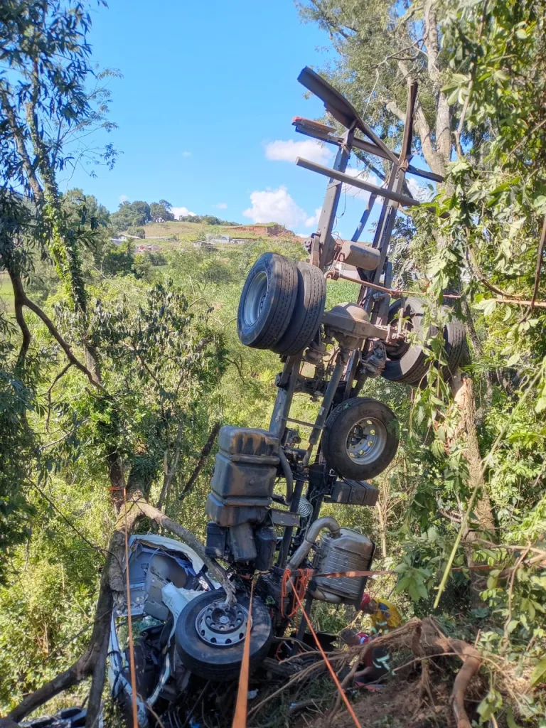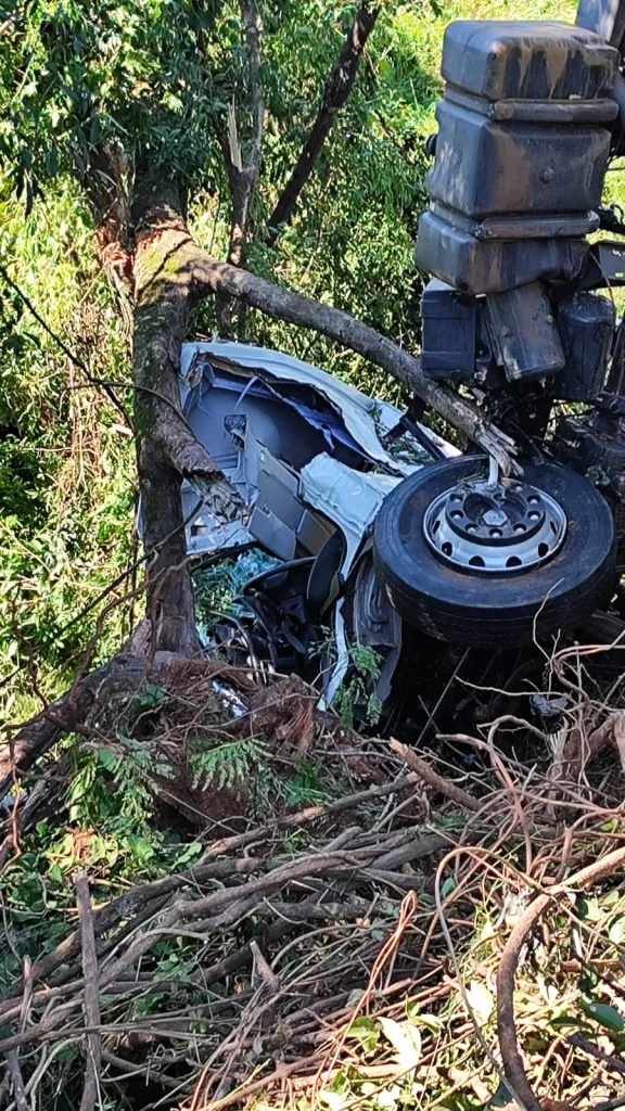 No local, os socorristas encontraram o caminhão em uma área de desnível de aproximadamente 10 metros, com a cabine apoiada sobre uma árvore. O condutor estava no interior do veículo, consciente e orientado, porém com ferimentos na face e preso às ferragens, caracterizando encarceramento tipo físico II.