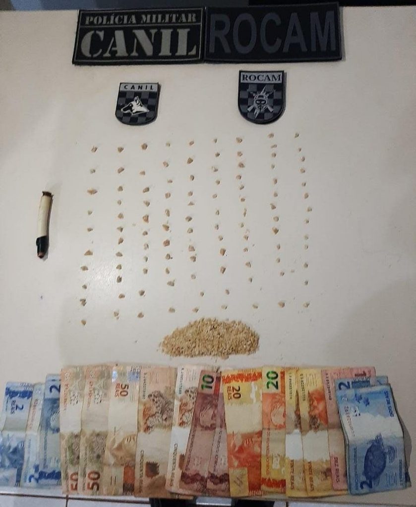 De acordo com a PM, ele foi identificado como um homem de 30 anos. Em revista pessoal, foi localizado na carteira dele a quantia aproximada de R$378,00 reais em notas fracionadas. Desta forma foi acionado o canil, e em buscas o cão localizou no referido porão uma sacola que tinha aproximadamente 107 pedras de crack fracionadas para o comércio e uma sacola com aproximadamente 14 gramas de crack em farelo.
