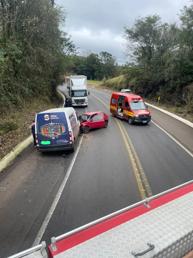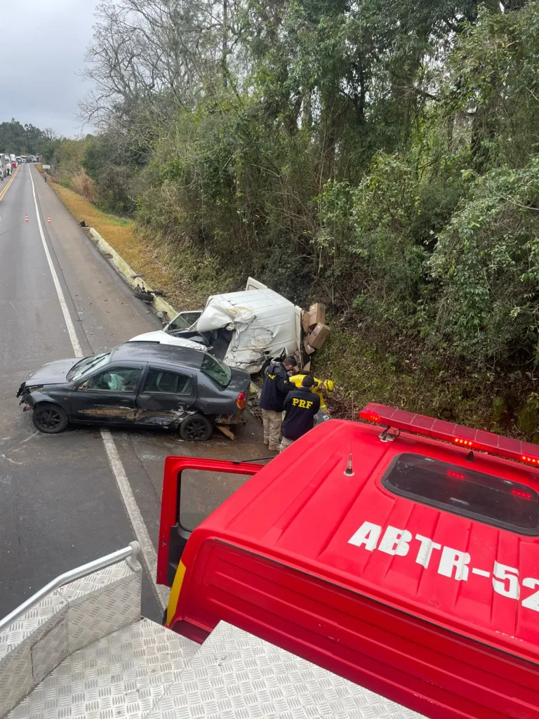 Um homem morreu em um acidente com quatro veículos: Renault Clio, Van Master, VW Gol e Fiat Fiorino. O fato ocorreu na BR-282 em Xaxim e foi registrado às 11h20 desta sexta-feira, 08.