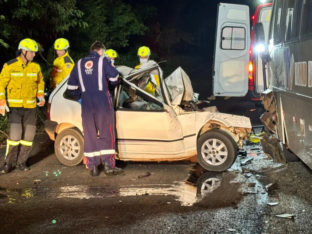 De acordo com o Corpo de Bombeiros, a ocorrência envolveu uma colisão entre um automóvel e um ônibus. As informações iniciais já indicavam que havia uma vítima encarcerada no veículo.