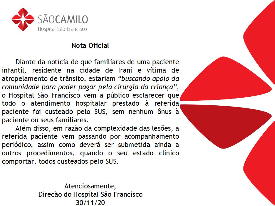 O Hospital São Francisco de Concórdia lançou nota na tarde desta segunda-feira(30) anunciando o cancelamento de todos os procedimentos cirúrgicos eletivos no período de 2 a 9 de dezembro. Tal decisão é devido o aumento de pacientes internados nas últimas semanas em decorrência da Covid-19, bem como a ocorrência de alguns afastamentos de servidores pelo mesmo motivo.
