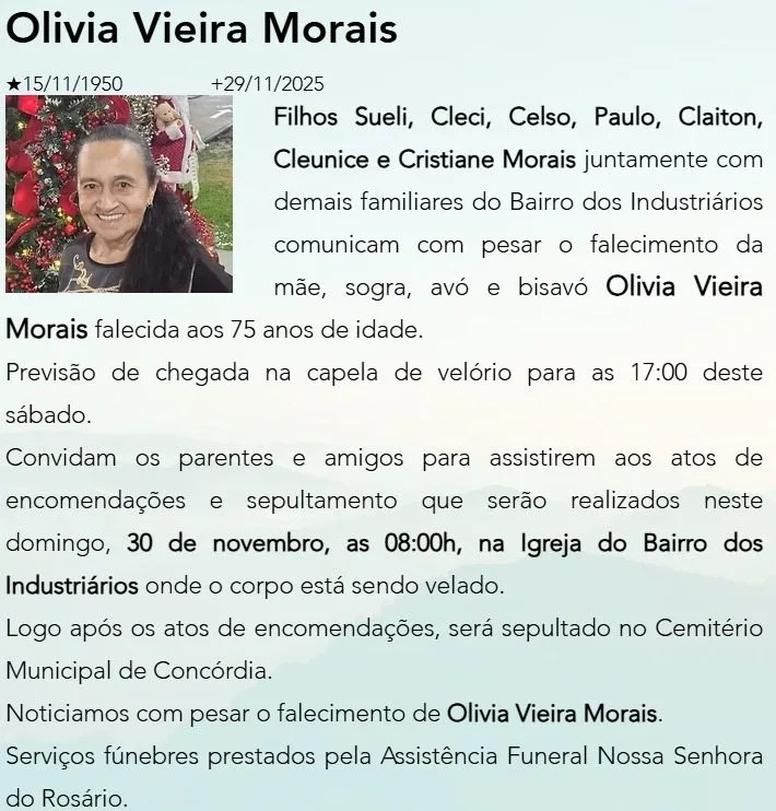 Faleceu durante a madrugada deste sábado, dia 29, no Hospital São Francisco de Concórdia, a idosa Olivia Vieira Morais, de 75 anos, que havia sido atropelada no fim da tarde de sexta-feira, na Rua Marechal Deodoro, no bairro Nazaré, em Concórdia. O acidente foi atendido pelos Bombeiros Voluntários por volta das 17h30.