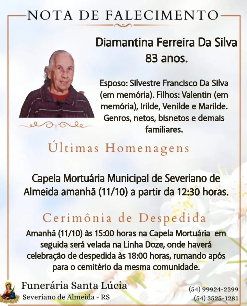 Os serviços fúnebres estão sob responsabilidade da Funerária Santa Lúcia, de Severiano de Almeida.