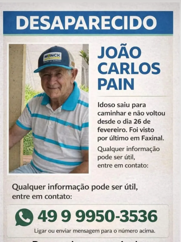 De acordo com informações repassadas pela guarnição dos Bombeiros, o desaparecimento de João Carlos Pain foi comunicado ainda na noite do dia 27. O idoso, diagnosticado com Alzheimer, teria saído de Xanxerê caminhando em direção a Faxinal dos Guedes. Ele foi visto pela última vez nas proximidades do posto de combustível Russi, no primeiro trevo de acesso ao município.