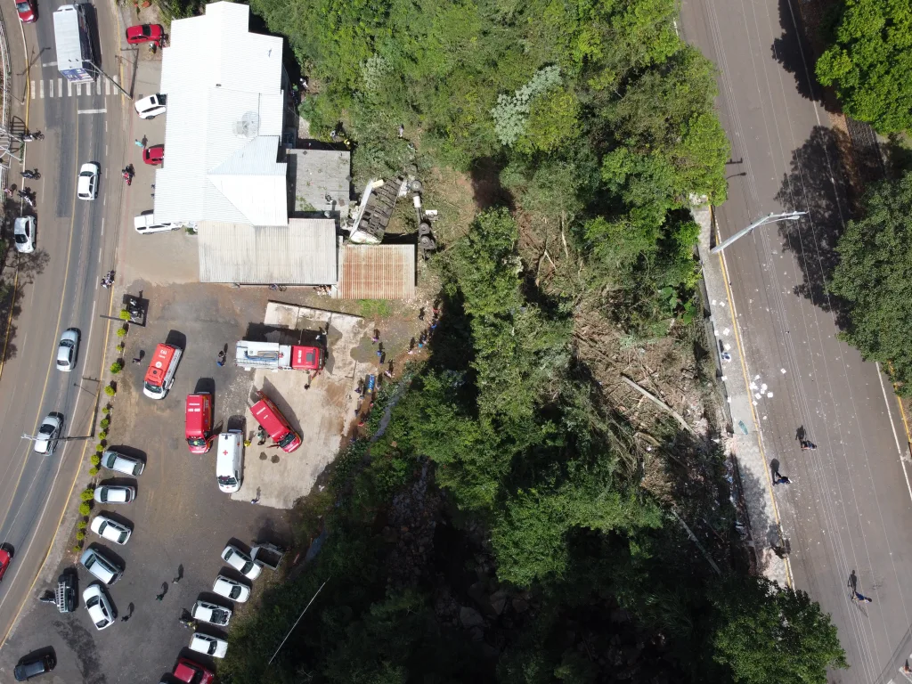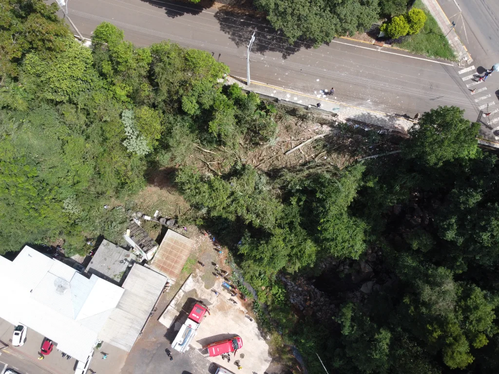 Imagens enviadas pelo ouvinte Aires Mausolf feitas com o uso de um drone mostram o cenário pós-acidente na rua 3 de Abril, em Seara. O caminhão acabou colhendo um carro. Os dois veículos despencaram ao lado da Casa de Carnes Dalle Laste.