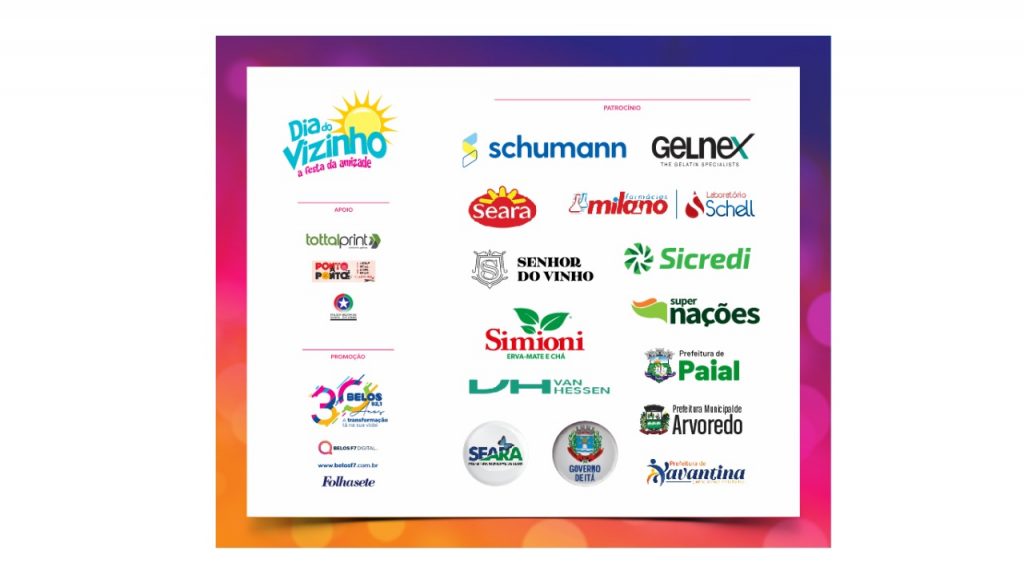 Encerram nesta sexta-feira, 29 de julho, as inscrições para mais uma edição da Festa da Amizade/Dia do Vizinho. O evento será realizado no dia 21 de agosto. Em Seara as inscrições podem ser feitas na Belos FM. Em Xavantina, Arvoredo e Paial, na prefeitura. Já em Itá as inscrições são realizadas na Casa da Cultura.