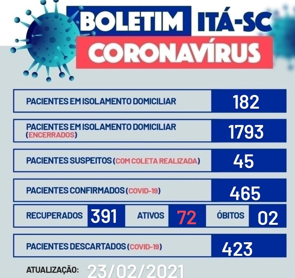 O número de casos ativos de coronavírus em Itá mostra que as medidas de restrições no município são mais do que necessárias. Itá tem 72 casos de Covid-19 ativos neste momento, segundo boletim divulgado pela Secretaria Municipal da Saúde nesta manhã de terça-feira, 23 de fevereiro.