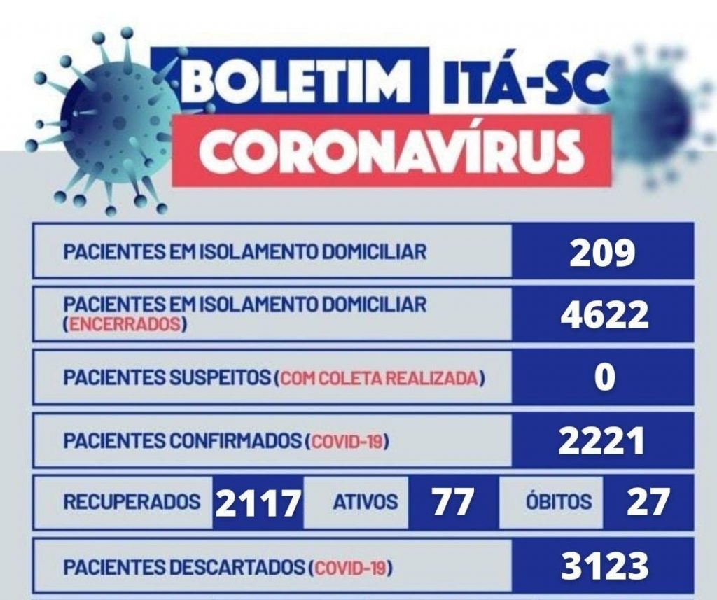 Itá segue com aumento nos casos ativos de Covid-19. Ontem, dia 7, eram 67 e hoje há 77 pessoas com a doença ativa. Confira o boletim completo: