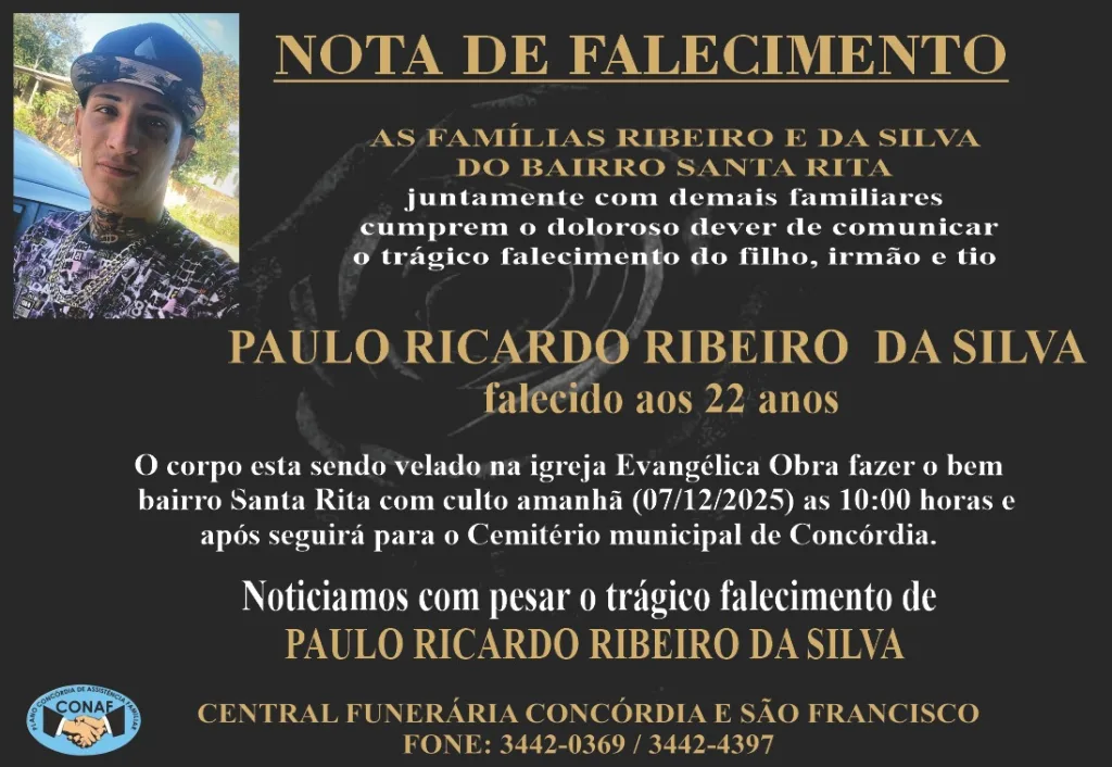 Um jovem de 22 anos, identificado como Paulo Ricardo Ribeiro da Silva, morreu na noite desta sexta-feira (02) após um acidente de motocicleta na Rua José Albiero, no bairro Santa Rita, em Concórdia.