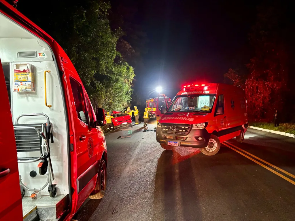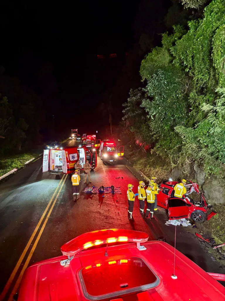 Bombeiros Militares de Cunha Porã e Maravilha, além do SAMU, Polícia Rodoviária Federal (PRF) e Polícia Militar foram acionados. Segundo os bombeiros, a Saveiro ficou completamente destruída com o impacto.