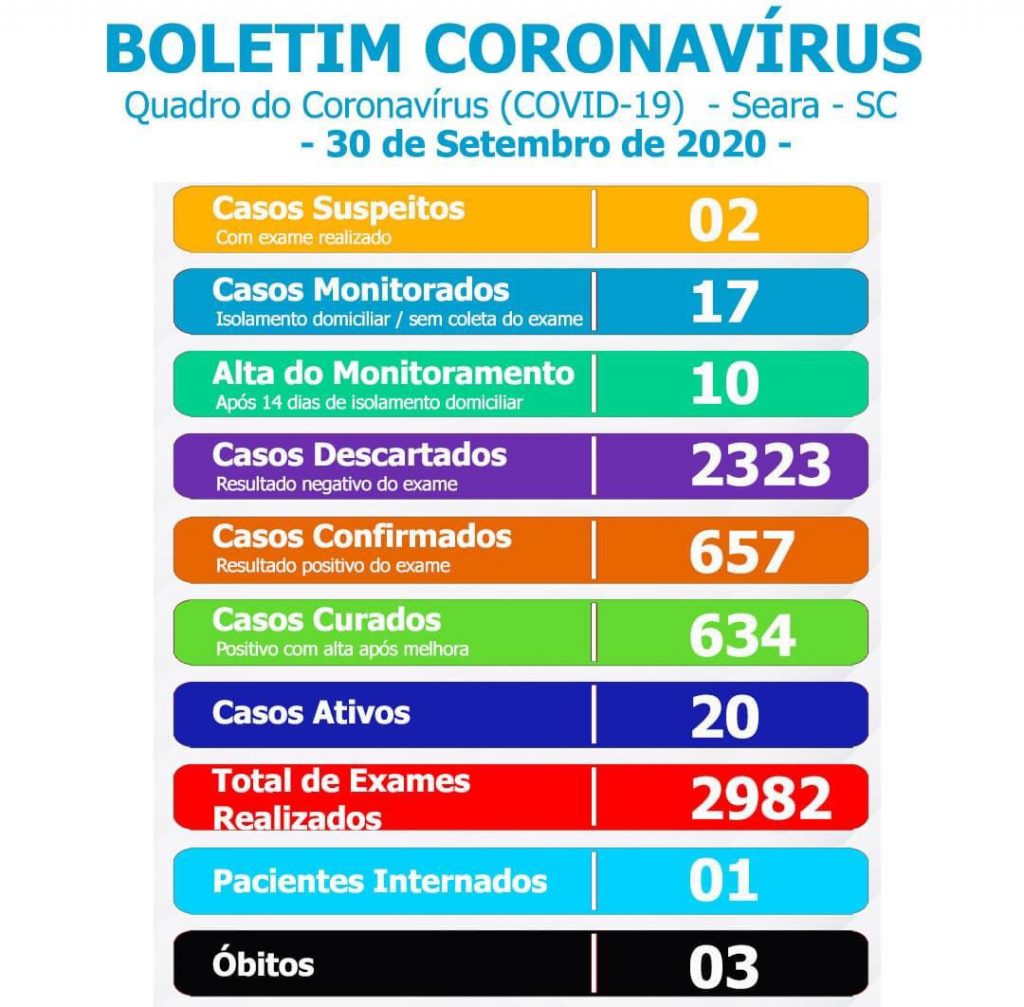 Segundo o boletim de hoje, há 657casos confirmados da doença em Seara, sendo 634já curados e 20 ativos. Um paciente esta internado no momento.