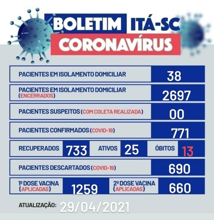 Ainda segundo dados divulgados na quinta-feira, 29, o município tem 25 casos ativos e 38 pacientes em isolamento domiciliar. Não há casos suspeitos no momento. Desde o início da pandemia Itá contabiliza 771 casos confirmados e 733 recuperados da Covid-19.