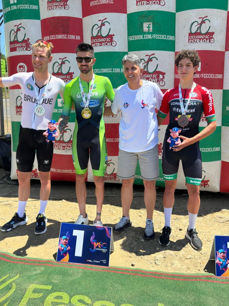 Gabriel Souza Silva fez o terceiro melhor tempo e garantiu lugar no pódio, durante a prova Contra Relógio, de Ciclismo, no naipe masculino, no sábado. O trajeto era na rodovia Pedro Rogério Garcia (Contorno Norte) entre o trevo próximo ao cemitério até a BR 153. Lauro Cesar Moro Chaman, de Tijucas, ficou com a primeira colocação, enquanto André Eduardo Gohr fez o segundo melhor tempo.