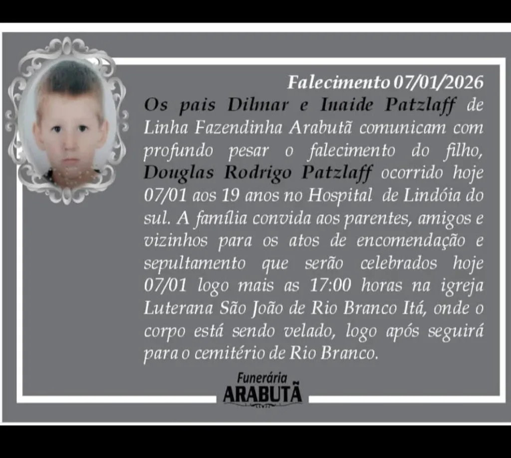 Morreu nesta quarta-feira, 7 de janeiro, o jovem Douglas Rodrigo Patzlaff, 19 anos. Douglas estava internado no Hospital Izolde Dalmora, de Lindóia do Sul, depois de sofrer um Acidente Vascular Cerebral (AVC) e não conseguir se recuperar. Segundo familiares, ele também teve uma meningite bacteriana que o deixou paraplégico e com com outras graves sequelas.