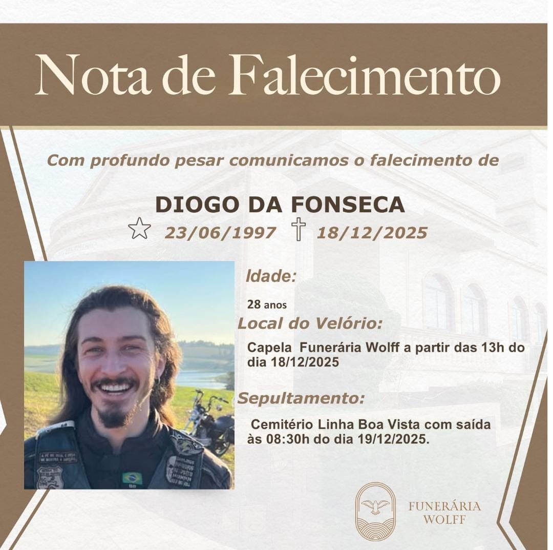 Foi identificado como Diogo da Fonseca, de 28 anos, o motociclista que morreu após colidir contra uma árvore na Avenida Fernando Machado, no bairro Líder, próximo à Mepar, em Chapecó. O acidente foi na madrugada desta quinta-feira, dia 18.