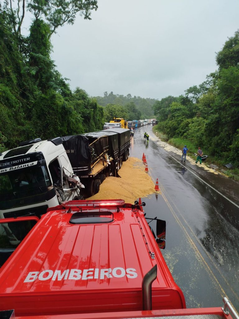 Por volta das 9h30 desta quinta-feira, 15, o Corpo de Bombeiros atenderam colisão lateral entre duas carretas na BR-282 em Iraceminha, sentido a São Miguel do Oeste.