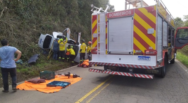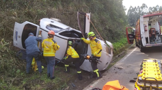 Conforme os bombeiros, a vítima foi encontrada ainda no interior do veículo capotado, consciente e orientada. Ela apresentou escoriações no braço esquerdo e edema na região do crânio. A mulher ainda relatou dores na perna direita.