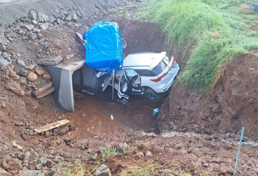 A ocorrência envolveu uma saída de pista seguida de colisão contra um barranco. O veículo, uma Toyota Hilux SW4 com placas de Iporã do Oeste, tracionava um reboque no momento do acidente.