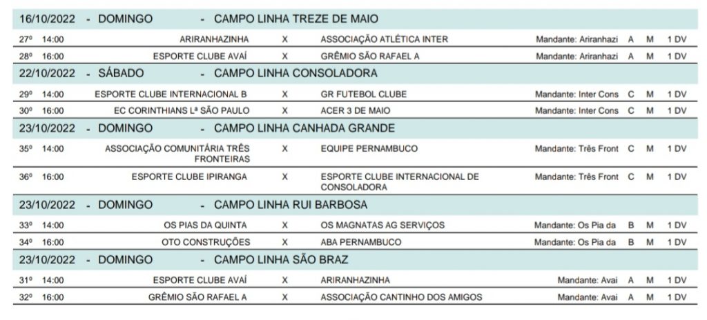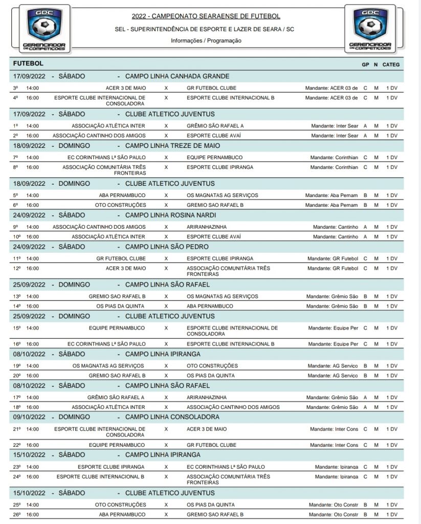O veterano e o feminino vão iniciar no mês de outubro. Confira a tabela completa da primeira fase. Abaixo o arquivo em PDF.
