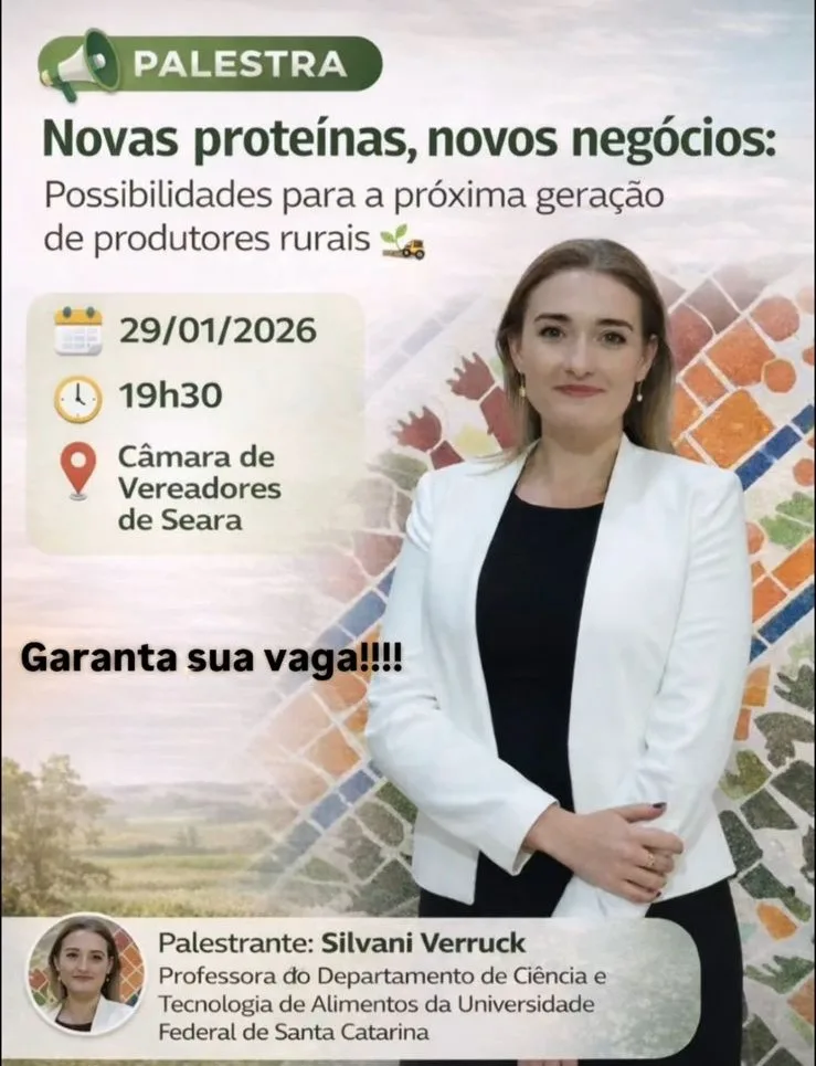 O Núcleo Agro Empreendedor da ACIS de Seara promove nesta quinta-feira, 29, uma palestra sobre “Novas proteínas, novos negócios: possibilidades para a próxima geração de produtores rurais”. O evento acontece às 19h30, no auditório da Câmara de Vereadores, e contará com a presença da professora do Departamento de Ciência e Tecnologia de Alimentos da UFSC, Silvani Verruck.
