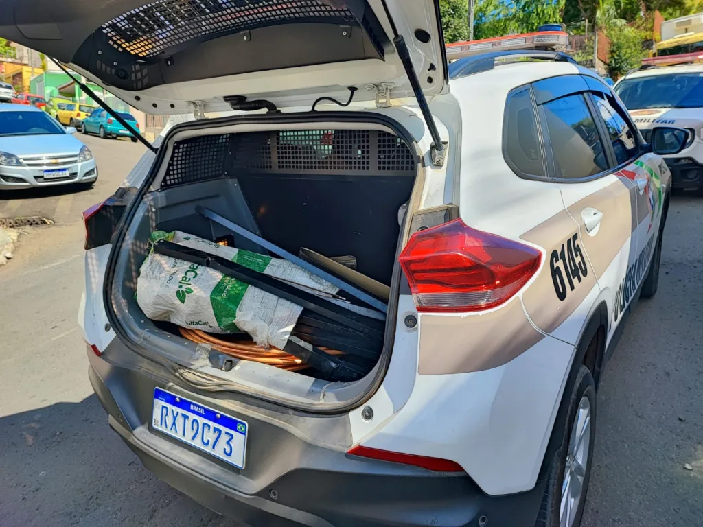 Ainda durante as vistorias, os policiais abordaram um homem que chegava ao mesmo estabelecimento transportando uma porta de lixeira de alumínio. Questionado, ele informou que havia furtado o objeto pouco antes, a cerca de 200 metros do local, informação que foi confirmada pelos policiais.