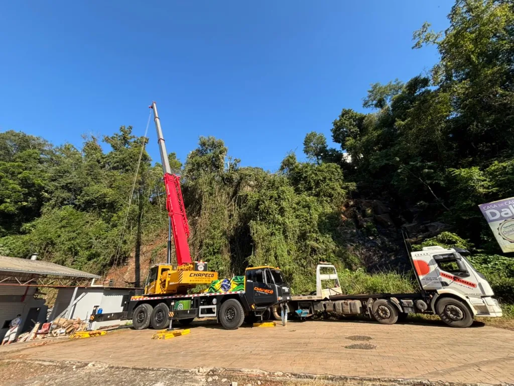 Um guincho trabalhava na retirada do caminhão que tombou na rua Três de Abril, em Seara, na última quarta-feira. A operação acontece na manhã desta sexta-feira, 3.