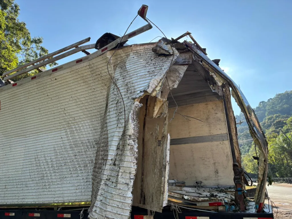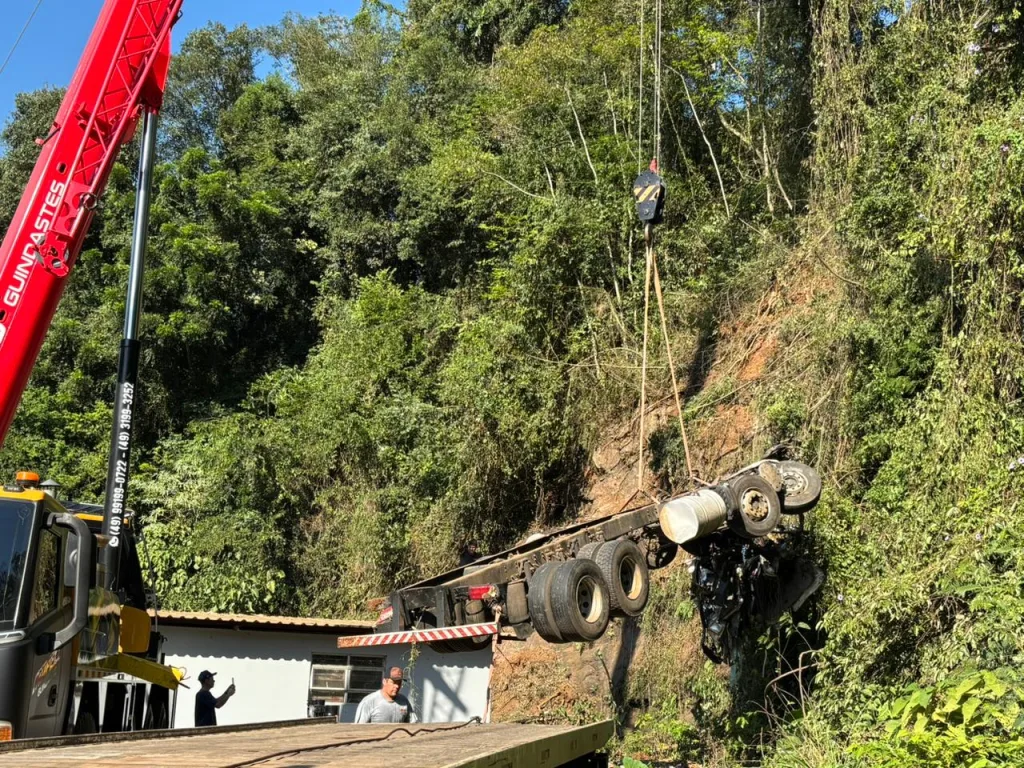O caminhão despencou nos fundos da Casa de Carnes Dalle Laste depois de bater em dois carros. O motorista permaneceu cerca de cinco horas nas ferragens, mas foi retirado com vida. Duas pessoas que estavam em um dos carros atingidos tiveram ferimentos leves.