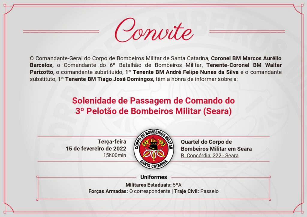 O corpo de Bombeiros Militar realiza na próxima terça-feira, dia 15, a partir das 15h, a solenidade de passagem de comando do 3º Pelotão de Bombeiro Militar de Seara.