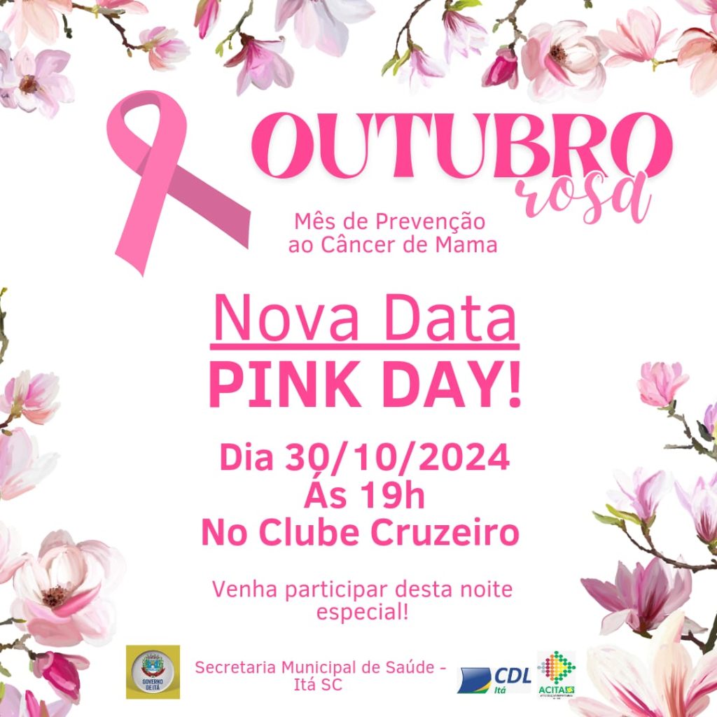 O evento Pink Day que aconteceria nesta quinta-feira, 24, no Clube Cruzeiro em Itá, foi transferido para a próxima semana. A programação alusiva ao Outubro Rosa acontecerá na quarta-feira, 30 de outubro, às 19h, no mesmo local. O evento contará com a participação da mastologista Karina Ciprini.