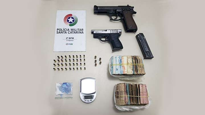 A segunda ocorreu por volta das 20h30, no bairro Cristo Rei. A guarnição efetuou uma abordagem veicular e foi localizada uma pistola Taurus, calibre 7,65mm, carregada com cinco munições e uma pistola calibre 32. Em seguida, na residência do abordado, foi localizada uma pistola de fabricação artesanal calibre 22, 35 munições do mesmo calibre, uma porção de cocaína, uma balança de precisão e dois pacotes de dinheiro em espécie, totalizando R$ 42.367,00.