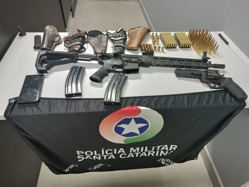 Durante a ação, os policiais apreenderam um fuzil calibre 5,56 mm, um revólver calibre .357, carregadores, mais de 100 munições de diversos calibres, além de coldres e estojos de munições deflagradas. Também foi constatado que havia registros anteriores de violência doméstica, sendo solicitadas medidas protetivas de urgência.