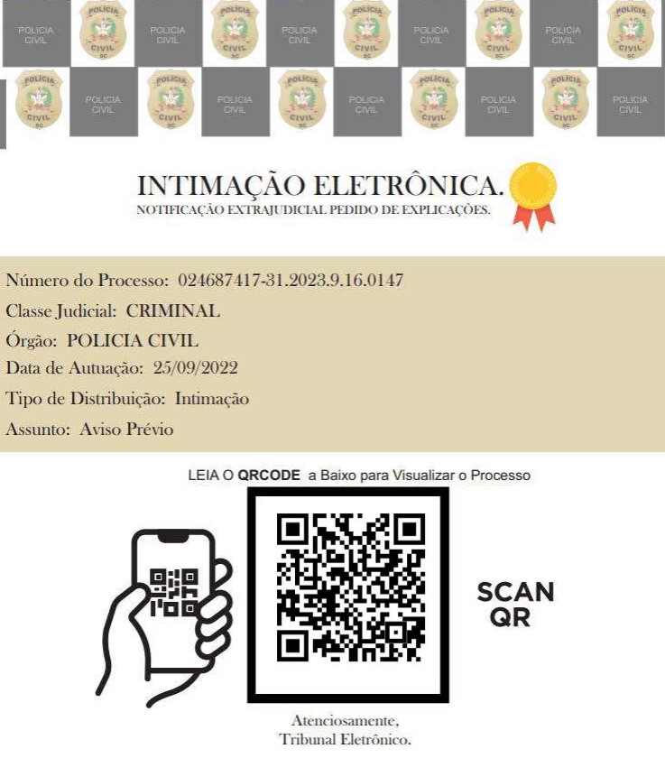 A Polícia Civil alerta para um golpe referente a uma suposta intimação digital. Segundo o informado, foram recebidas muitas informações que criminosos encaminham e-mail com uma suposta intimação para pessoas, dizendo ser da Polícia Civil de Santa Catarina. A intimação contém um QRcode que leva a pessoa para um vírus no computador, além de pedir para a pessoa preencher dados pessoais.