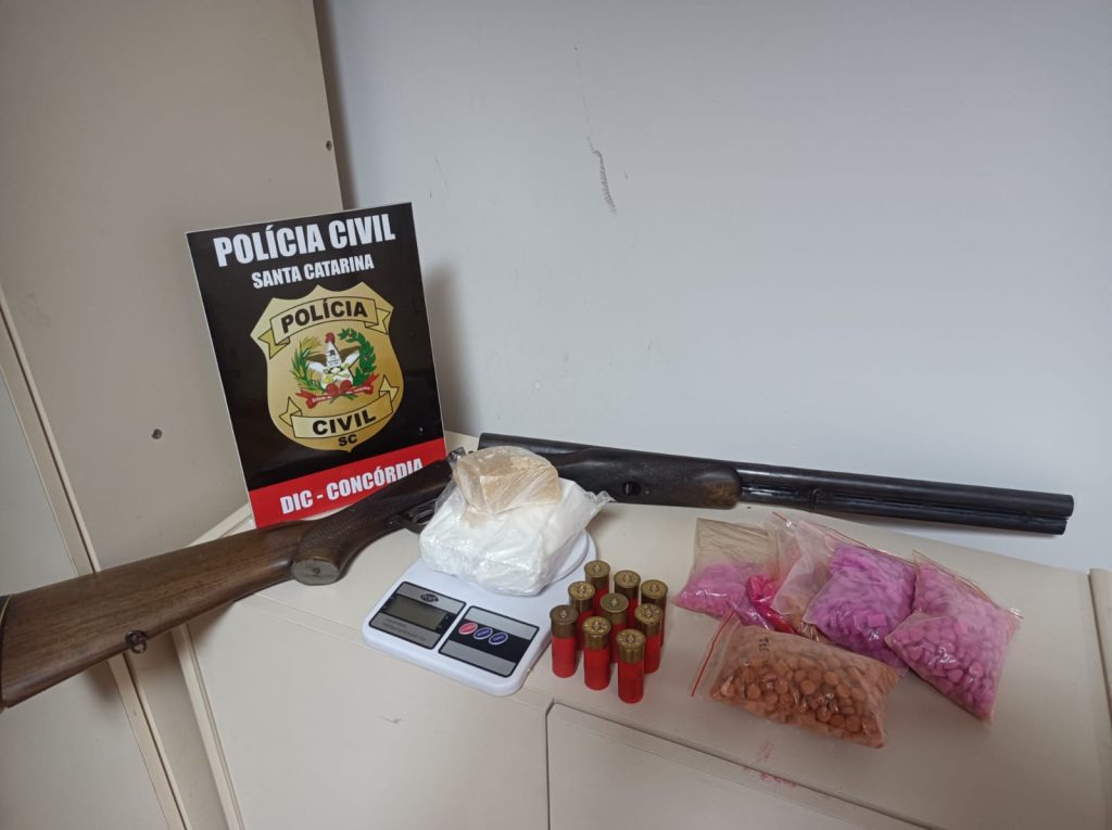 A Polícia Civil de Concórdia, com apoio de policiais da região, cumpriu nesta sexta-feira (31) mandado de busca e apreensão em uma casa na Vila União. Mais de 1.700 comprimidos e ecstasy foram localizados, além de um tablete de cocaína e uma pedra de crack. A polícia apreendeu ainda munições e uma espingarda.