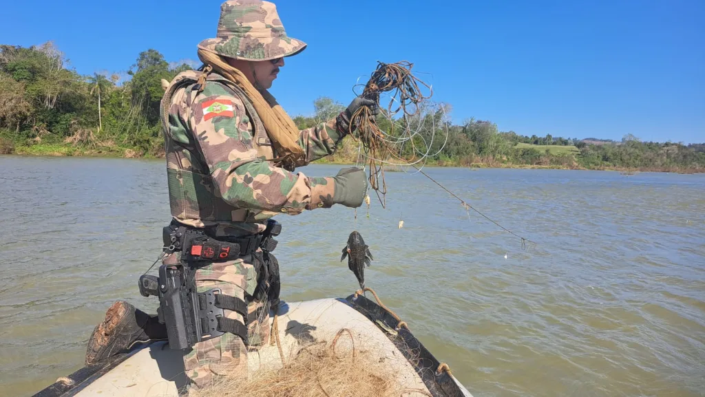A fim de fazer ações preventivas e em atendimento a denúncias anônimas, a Polícia Militar Ambiental (PMA) de Chapecó localizou e apreendeu grande quantidade de petrechos ilegais de pesca predatória nos rios Uruguai e Chapecó..