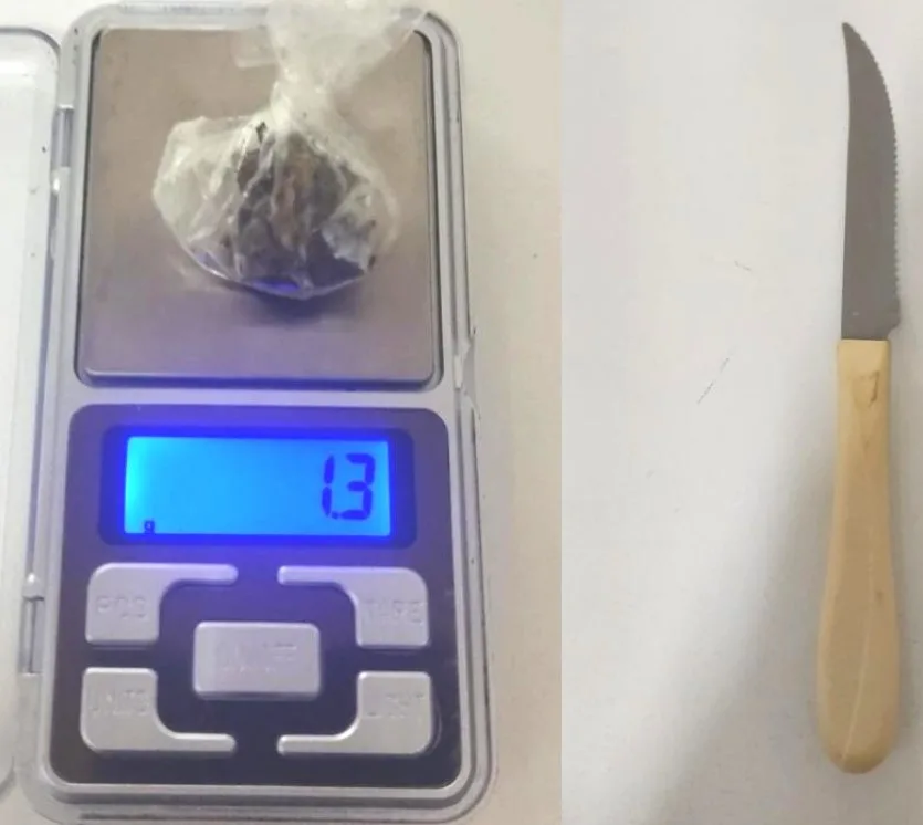 Na revista pessoal, os policiais apreenderam uma faca doméstica e uma porção de aproximadamente 1,3 grama de substância análoga à maconha.