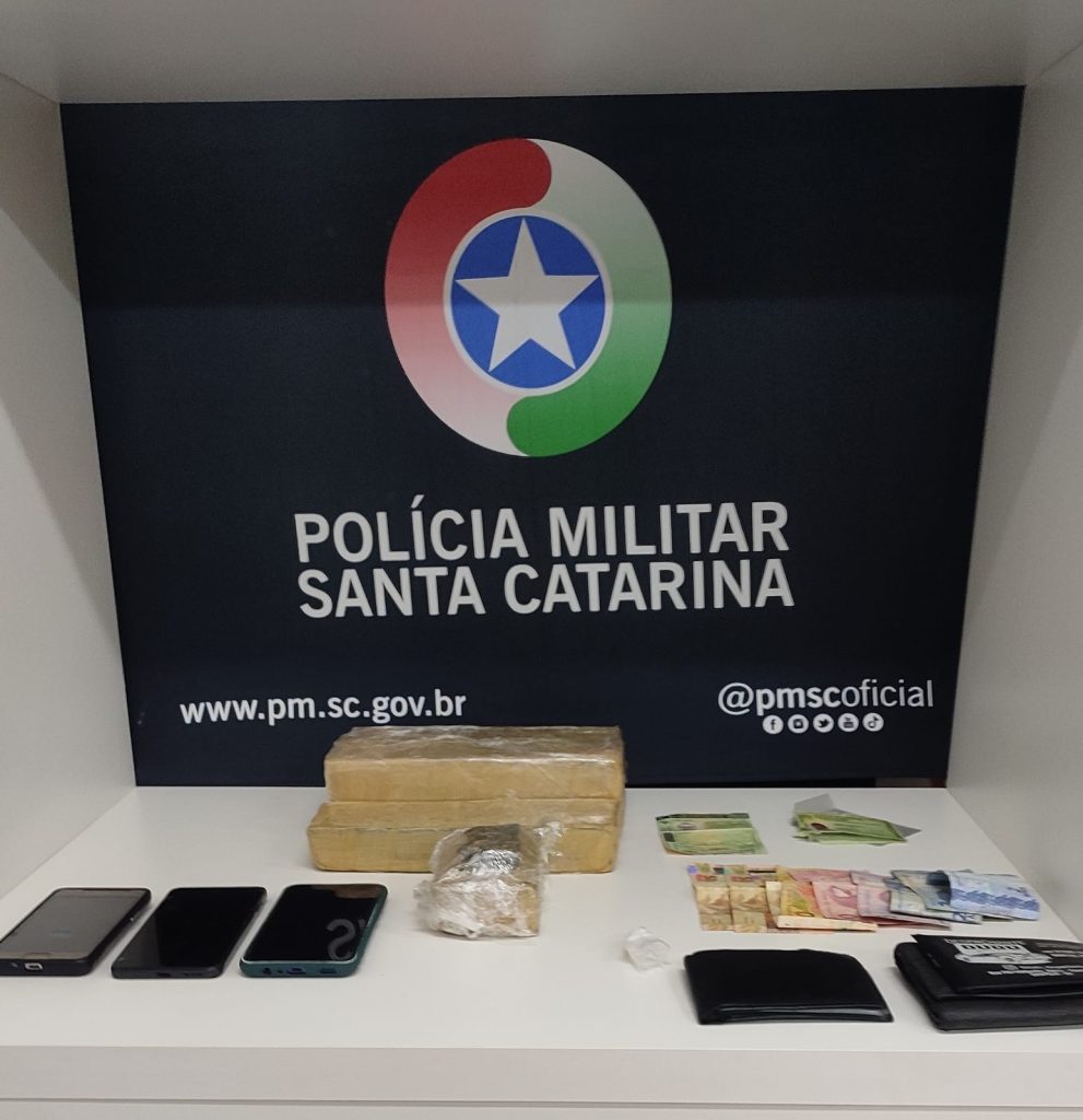 No veículo ainda estavam duas pessoas. Em busca veicular foram encontrados cerca de três quilos de maconha dentro de uma mochila.
