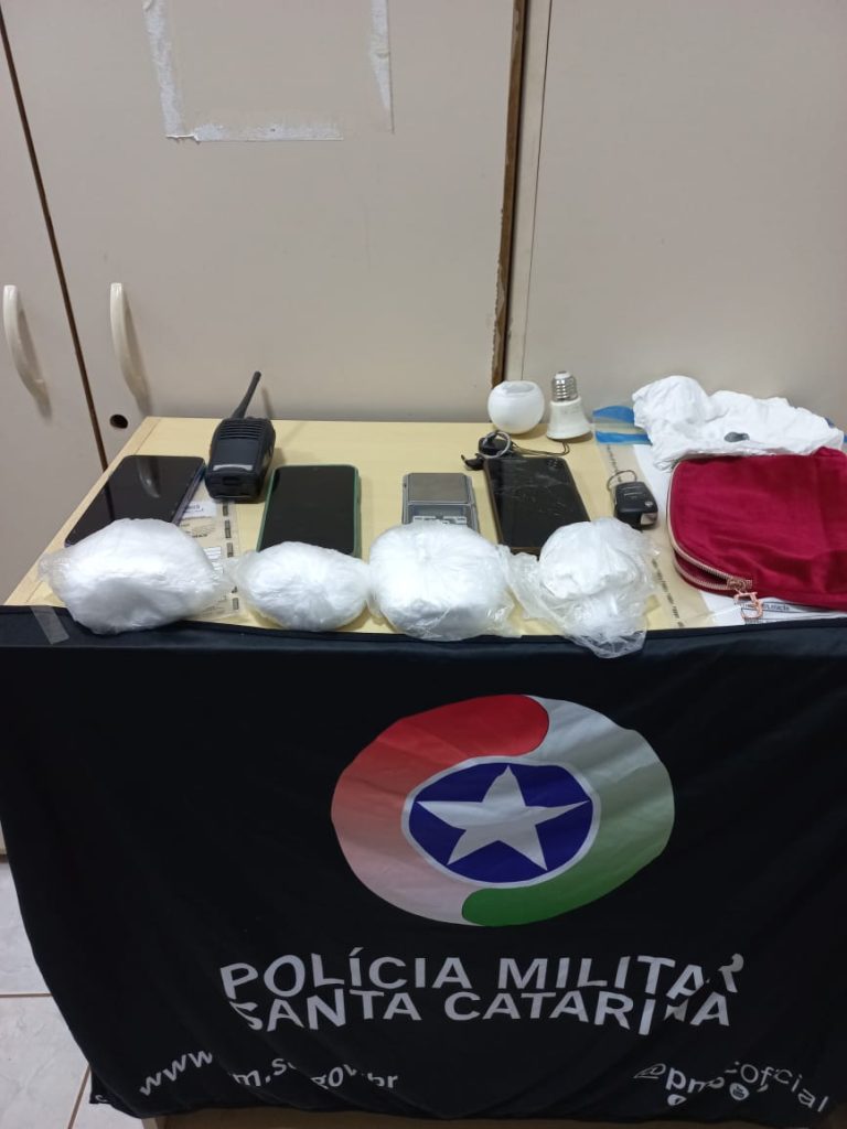 Guarnições realizaram a abordagem e detiveram a mulher de 26 anos, que encontrava-se com uma bucha de cocaína, um rádio comunicador e celulares em sua posse. Os policiais se deslocaram até a residência de um dos suspeitos, no bairro São João Maria, e localizaram uma pedra de crack de aproximadamente cinco gramas escondida em uma lâmpada da residência, além de uma balança de precisão.