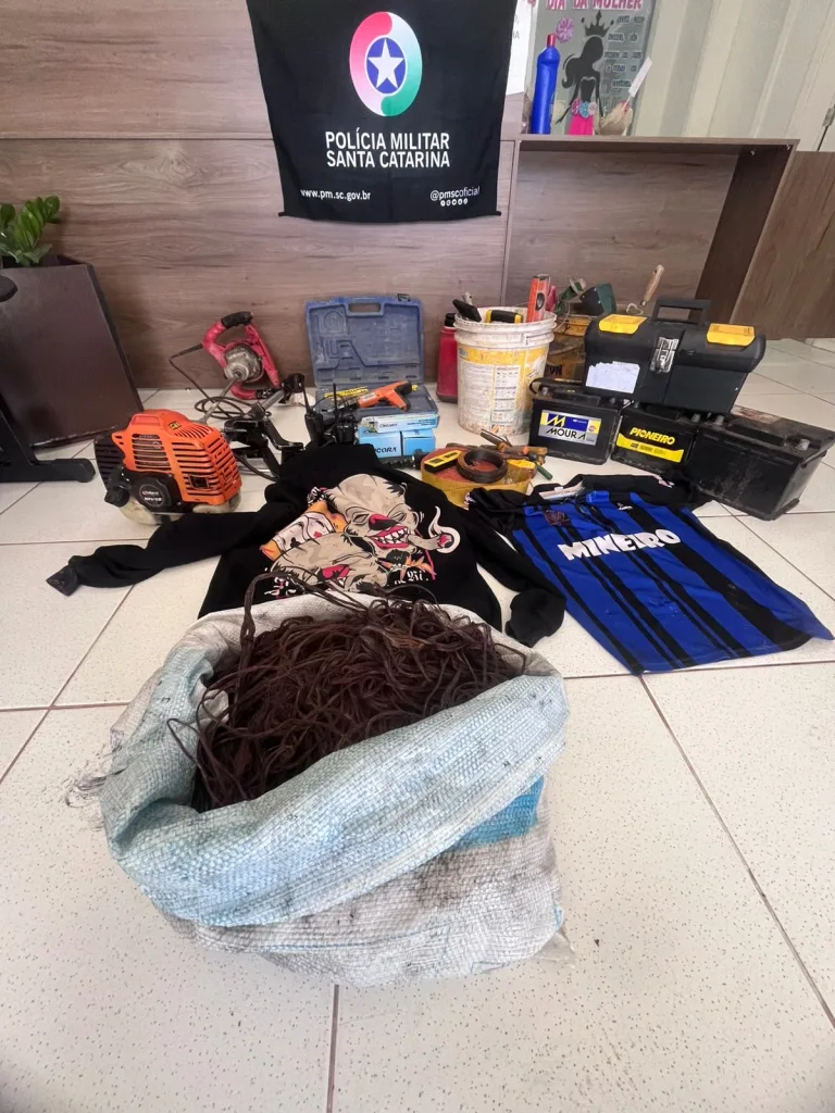 No interior do veículo, os policiais encontraram diversas ferramentas e objetos furtados da obra. Durante a abordagem, os suspeitos admitiram a autoria do crime e informaram que parte do material, como fios de cobre, havia sido vendida em um estabelecimento comercial.