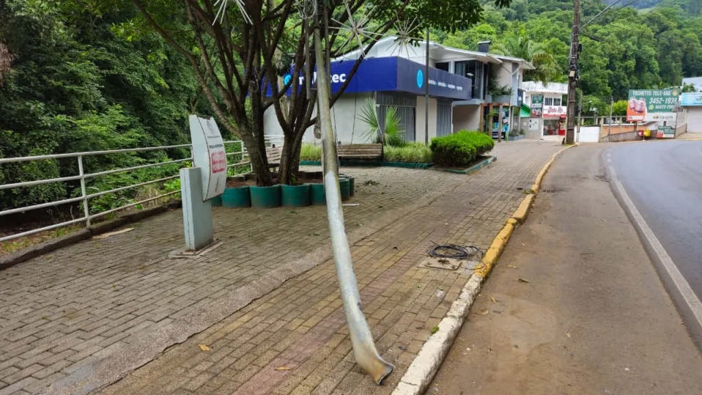 Um poste na praça Katius Pereira, na avenida Beira Rio, foi danificado no fim de semana (20 e 21). Na manhã desta segunda-feira, o poste segue caído sobre árvores e iluminação natalina. A Celesc deverá fazer a substituição nesta semana. Não há informações sobre a ocorrência, mas a suspeita é de que um veículo tenha colidido na madrugada do domingo.