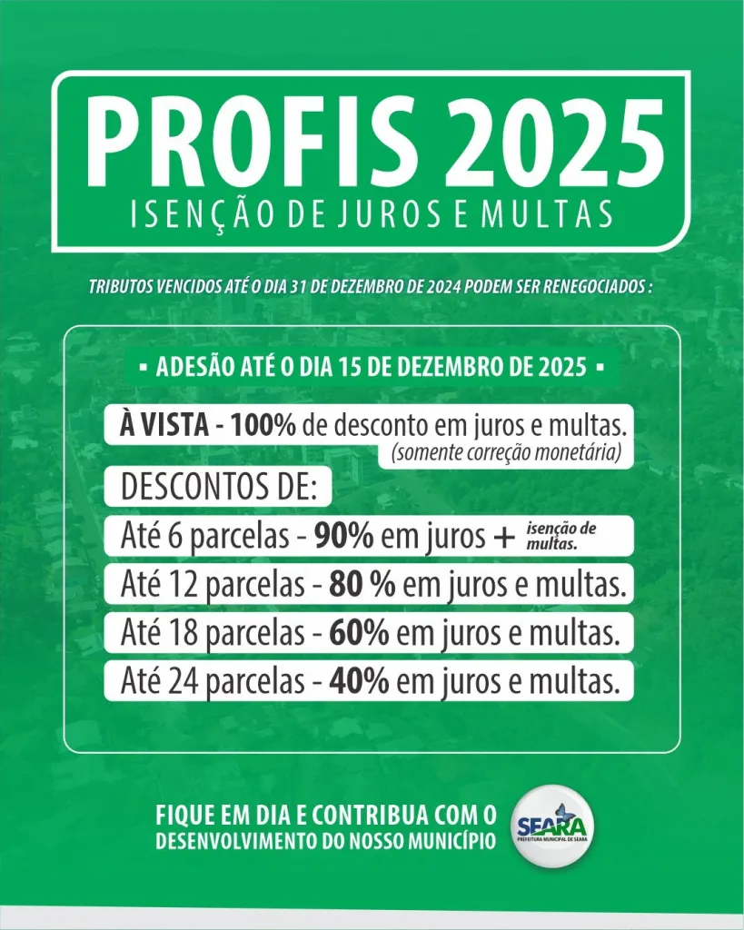O prazo para adesão ao Programa de Recuperação Fiscal (PROFIS) Seara está em sua reta final. Os contribuintes que possuem débitos com o município, vencidos até o dia 31 de dezembro de 2024, têm até a próxima segunda-feira, 15 de dezembro, para aderir ao programa e regularizar suas pendências com condições especiais.