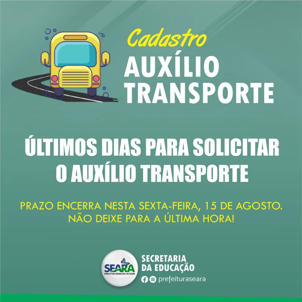 O prazo para realizar o cadastro do Auxílio Transporte junto a Secretaria de Educação de Seara termina nesta sexta-feira, 15 de agosto. O processo, aberto em 1º de julho, deve ser feito exclusivamente pelo site www.seara.atende.net, acessando o link útil Cadastro Auxílio Transporte.