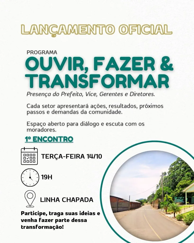A Prefeitura de Arvoredo lança, na próxima terça-feira, dia 15, às 19h, o programa “Ouvir, Fazer & Transformar”, uma nova iniciativa que tem como objetivo aproximar ainda mais a administração pública da comunidade. O primeiro encontro será realizado na comunidade de Linha Chapada, marcando o início de uma série de reuniões abertas à população.