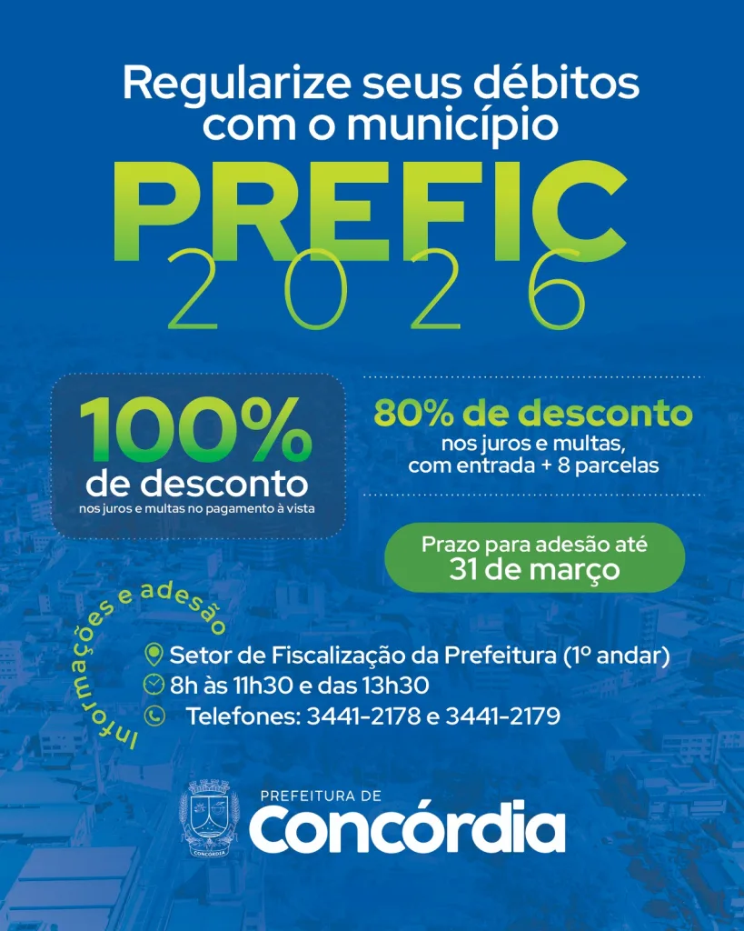 A Administração Municipal de Concórdia lançou o Programa de Recuperação Fiscal – PREFIC 2026, para regularização de créditos tributários e não tributários, de contribuintes em débito com o município. O programa foi viabilizado por meio de projeto de lei elaborado pelo Executivo, que foi aprovado na Câmara e sancionado na última sexta-feira, 27.