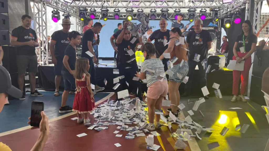 Foi realizado neste domingo, 15, na Praça de Alimentação da Efaics 2026, o primeiro sorteio da campanha Sua Nota tem Valor, que distribuiu ao todo R$ 50 mil em prêmios entre consumidores participantes. Neste domingo foram sorteados R$ 25 mil. Diversos consumidores foram contemplados com valores que variam entre R$ 10 mil e R$ 1 mil.