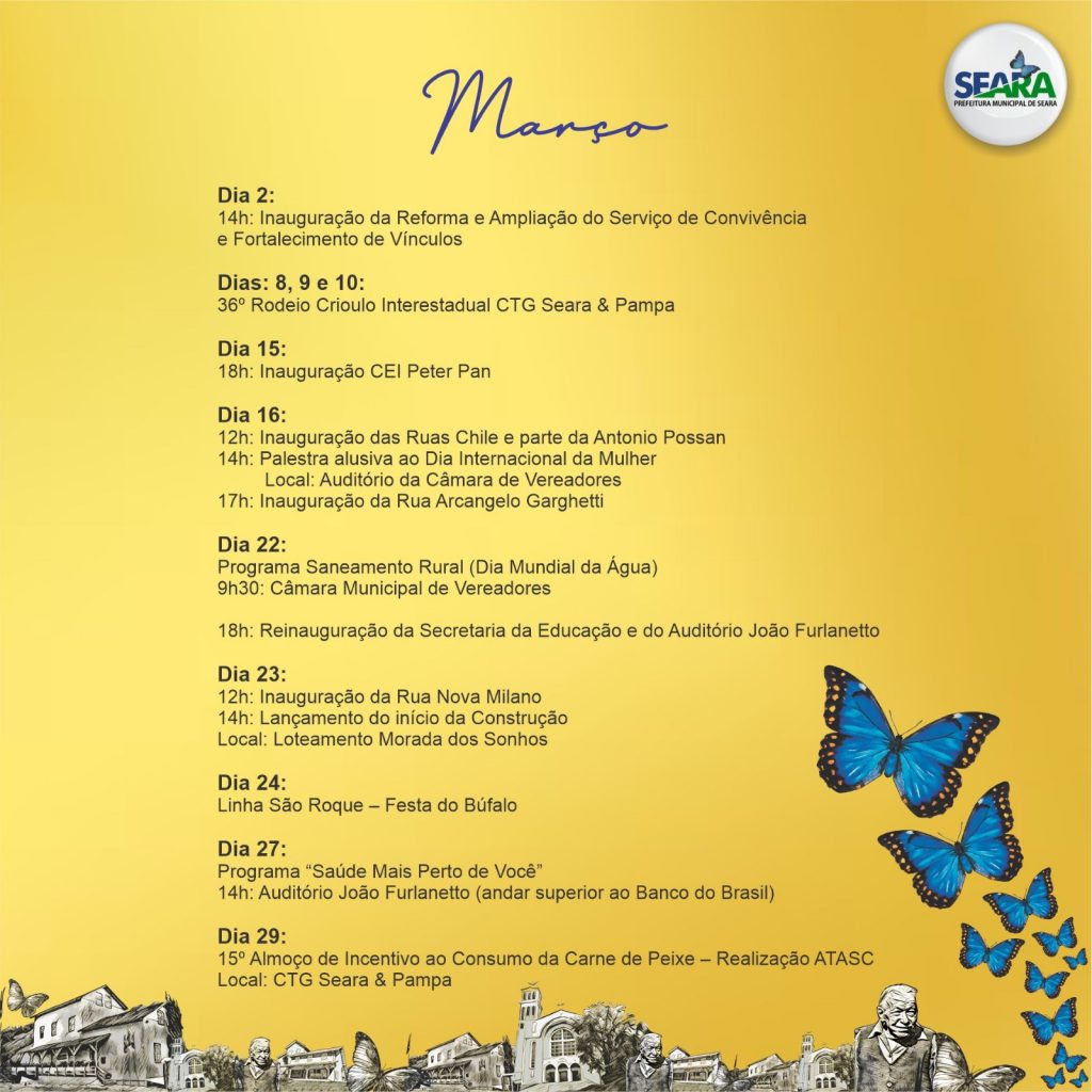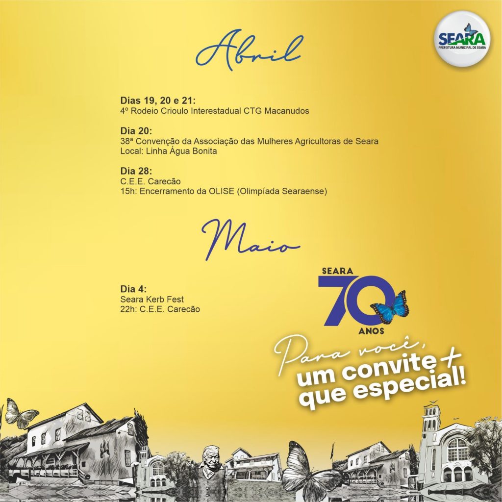 A prefeitura de Seara divulgou nesta quarta-feira, 28, a programação de eventos dos 70 anos de emancipação político-administrativa do município. O aniversário é celebrado em 3 de abril, mas as festividades iniciam ainda no mês de março, com destaque para o 36º Rodeio Crioulo do CTG Seara e Pampa, nos dias 8, 9 e 10, Festa do Búfalo no dia 24 e o 15º Almoço de Incentivo ao Consumo da Carne de Peixe, em 29 de março. No mês ainda tem várias inaugurações de obras, pavimentações de ruas e reformas dos prédios públicos.