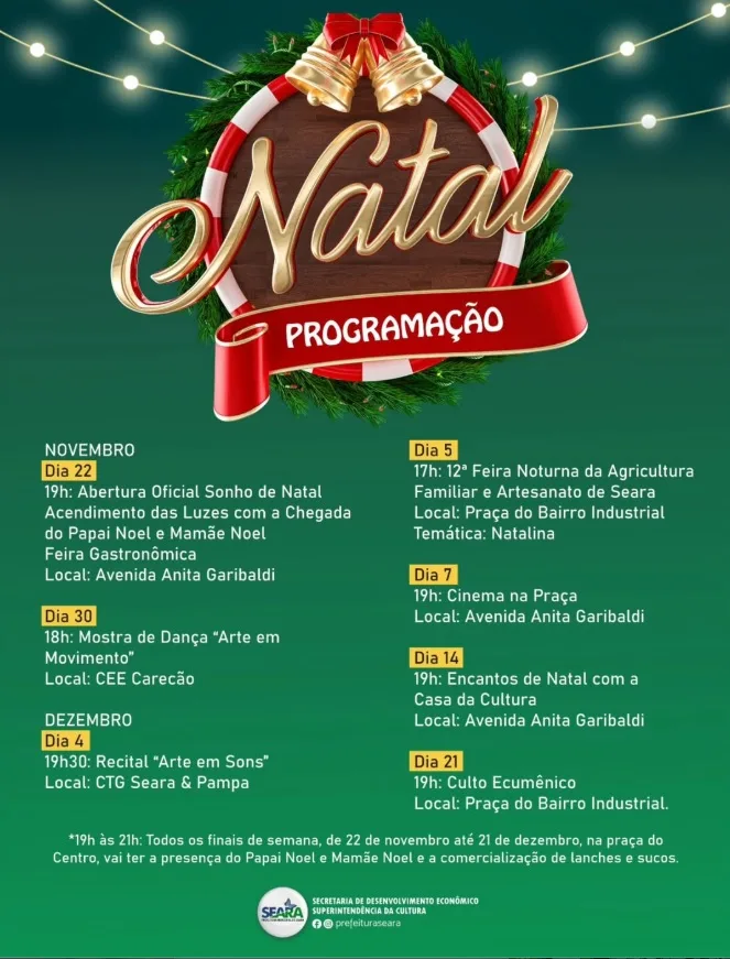 A programação Sonho de Natal da Prefeitura de Seara terá nesta semana vários eventos culturais e gastronômicos. Na quinta-feira, 4, haverá o Recital “Arte e Sons” da Casa da Cultura, com início às 19h30, no CTG Seara & Pampa.