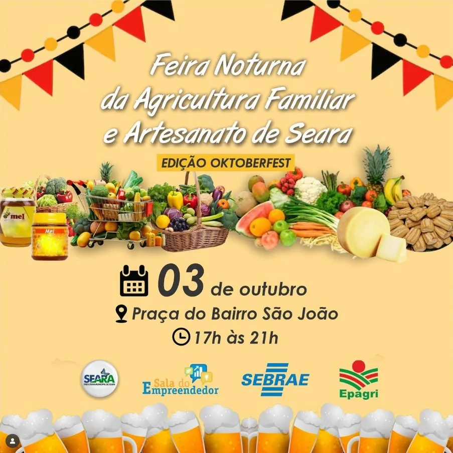 A 10ª edição da Feira Noturna da Agricultura Familiar e Artesanato de Seara acontecerá na próxima sexta-feira, 3 de outubro, das 17h às 21h, na Praça Henriqueta Zanuzzo. O evento entrará no clima da “Oktoberfest”, com apresentações do Grupo de Danças Alegria das Borboletas e da Casa da Cultura.