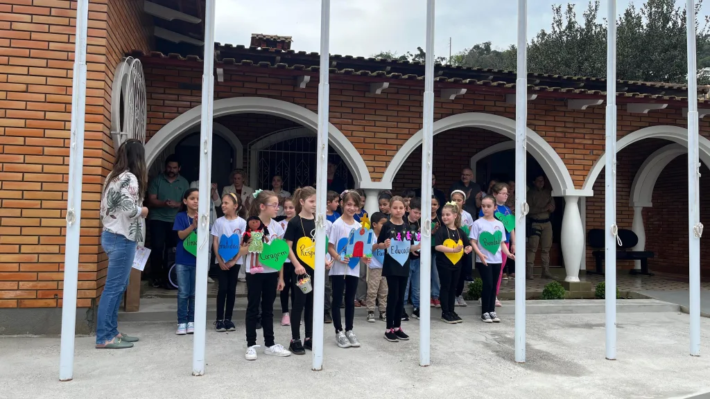 Na tarde desta segunda-feira, 1° de setembro, a Rede Estadual de Ensino realizou a Abertura da Semana da Pátria, em frente a Coordenadoria Regional de Educação (CRE) de Seara. O ato oficial contou com a presença de alunos da EEB Raimundo Corrêa, autoridades e servidores da CRE. As crianças declamaram o poema “O que é Pátria meu menino?” e cantaram a música “Herdeiros do Futuro”, de Toquinho.