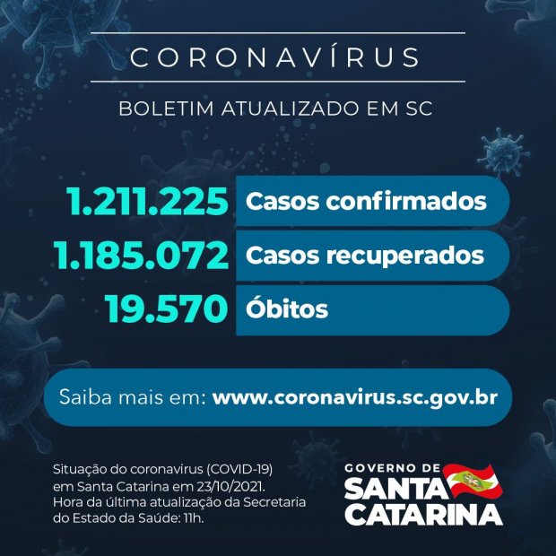 O Governo do Estado informou que há 1.211.225 casos confirmados de infecção pelo novo coronavírus em Santa Catarina, dos quais 1.185.072 estão recuperados e 6.583 permanecem em acompanhamento. O número foi divulgado neste sábado, 23. A Covid-19 causou 19.570 óbitos no estado desde o início da pandemia. Esses números colocam a taxa de letalidade em 1,62%.