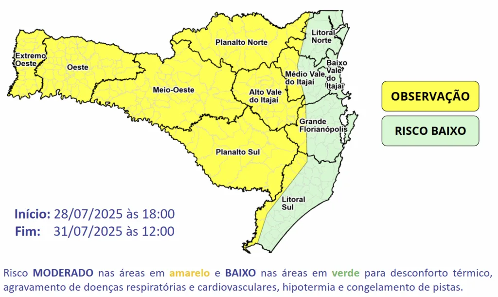 De acordo com informações da Secretaria de Estado da Proteção Defesa Civil, uma intensa massa de ar frio avança para o estado catarinense no decorrer desta segunda-feira, 28. Essa massa de ar, além de baixar bruscamente as temperaturas, vai estabilizar o tempo, sobretudo a partir da terça e se estendendo pelo restante da semana. O declínio de temperatura será mais intenso entre a noite desta segunda, 28, e o amanhecer de terça-feira, 29, onde a temperatura deve apresentar queda de aproximadamente 10°C, principalmente entre o Grande Oeste e os Planaltos, destacados nas áreas em amarelo do mapa.